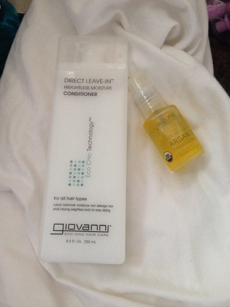 I scored BIG on this conditioner that is on sale at Sprouts this week with a bonus coupon; only 5 bucks a bottle (I will be going back today to stock up). The argon oil I use for my take downs and also for my skin care routine. Not pictured is my coconut oil.